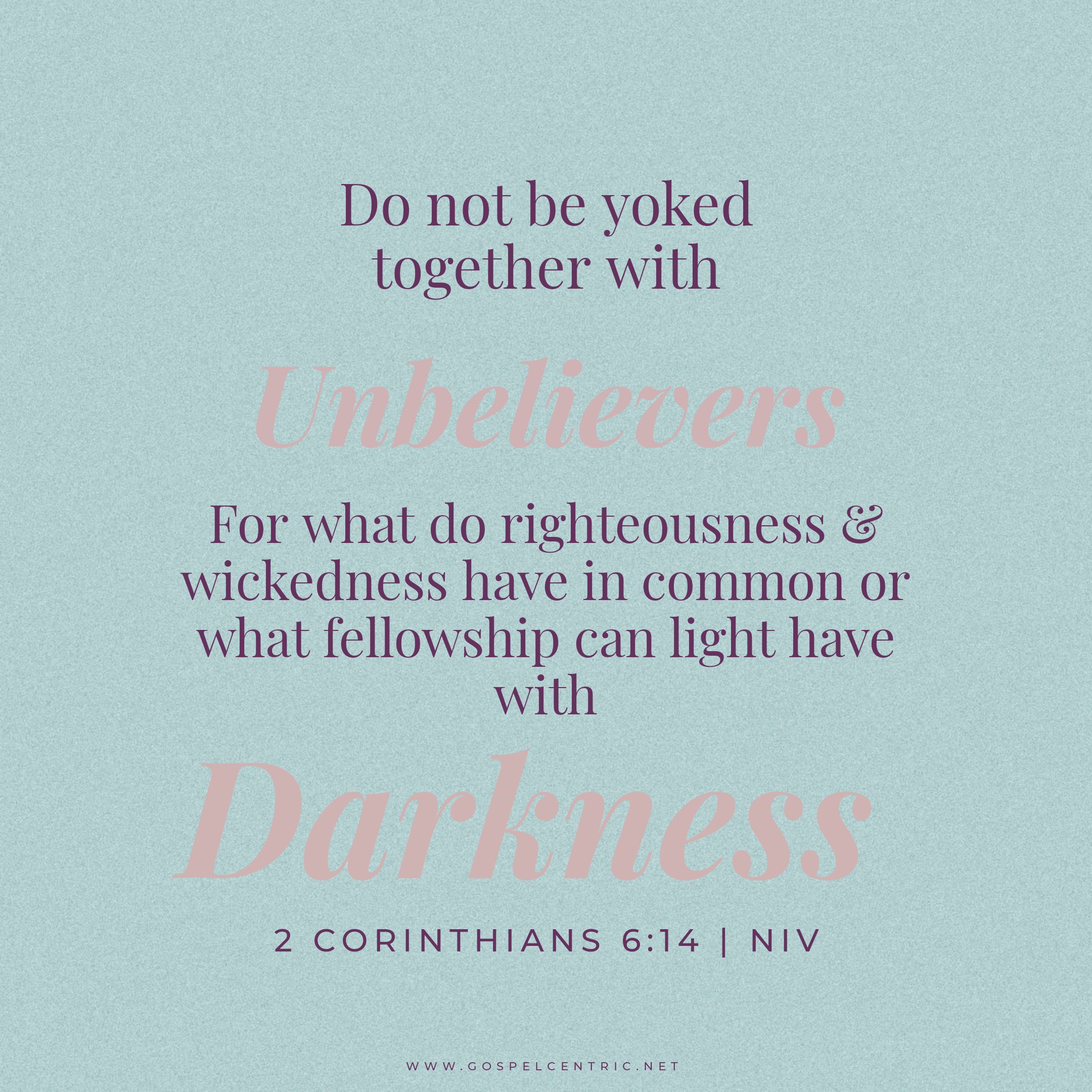 2 Corinthians 6 14 Do Not Be Yoked Together With Unbelievers For What Do Righteousness And Wickedness Have In Common Or What Fellowship Can Light Have With Darkness New International Version Niv